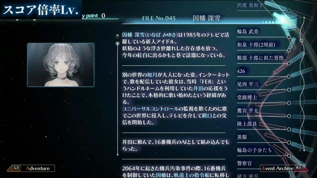 本作では累計スコアが一定値に達するとミステリーポイントというものがもらえます。このミステリーポイントは、究明編で閲覧できるミステリーファイルを取得するのに必要です。本作をより隅々まで理解したい方は、たくさんポイントが欲しいですね。