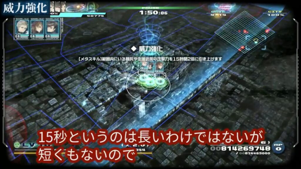 先ほどの移動速度強化と合わせて使うと、擬似的にリミッター解除状態にすることができます。6機の機兵がみんなリミッター解除したらとんでもないことになりますね。これをやる場合は、持続時間の長い移動速度強化の方を先に発動しましょう。